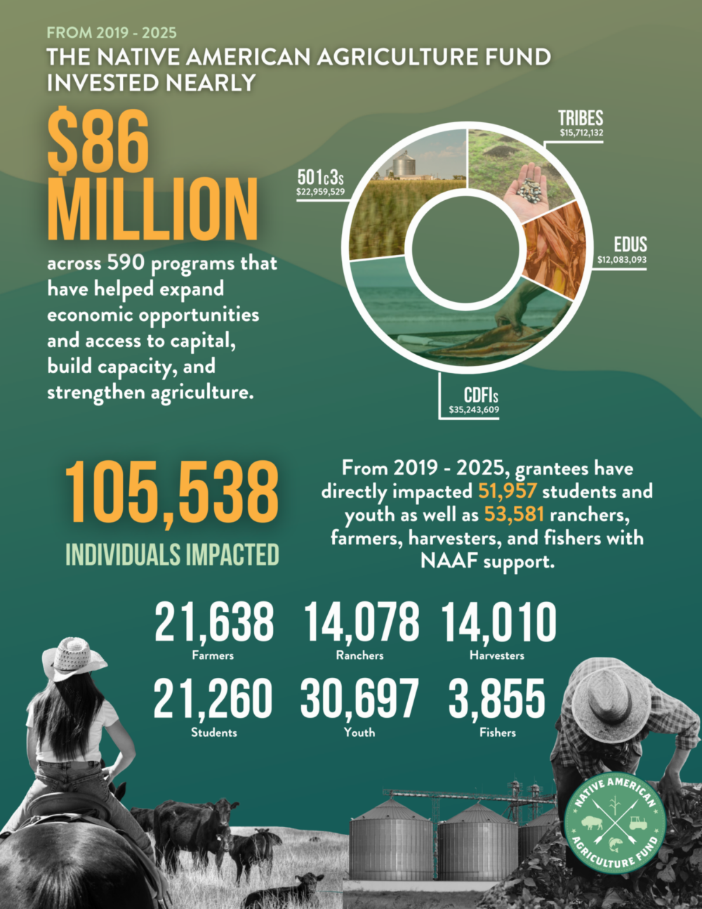 Explore how NAAF’s investments across Tribes, CDFIs, 501c3s, and educational institutions have helped strengthen Native agriculture, delivering nearly $86 million in funding and reaching more than 105,000 individuals since 2019. Click the link below to learn more.